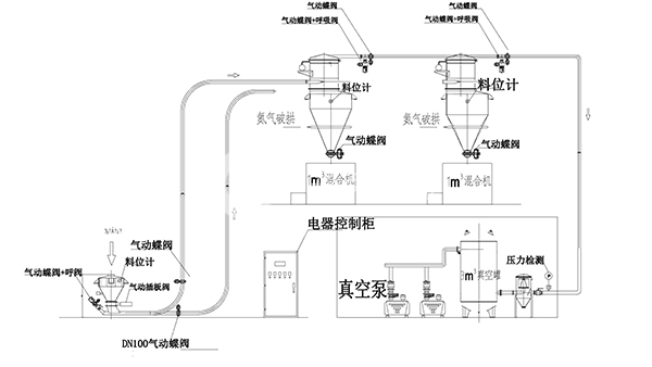 1. conveying materials: a mixture of creamer, sugar and coffee, with a mass ratio of 8:8:2 and a specific gravity of 0.6 ~ 0.6 after mixing. 2.The horizontal continuing distance is about 5m and the vertical height is about 6m. 3.The two conveying lines can be switched to two different mixers. 4.The parts in contact with materials are food grade SUS304. 5.All pipelines are food grade, and the inner wall is polished 6.The compressed air required by the system is 0.5MPa. (Note: the compressed air required for pulse meets the food requirements) 7.Equipment pipeline grounding. System conveying capacity: 6 t / h. Customization Description: the equipment can be customized according to customer requirements.